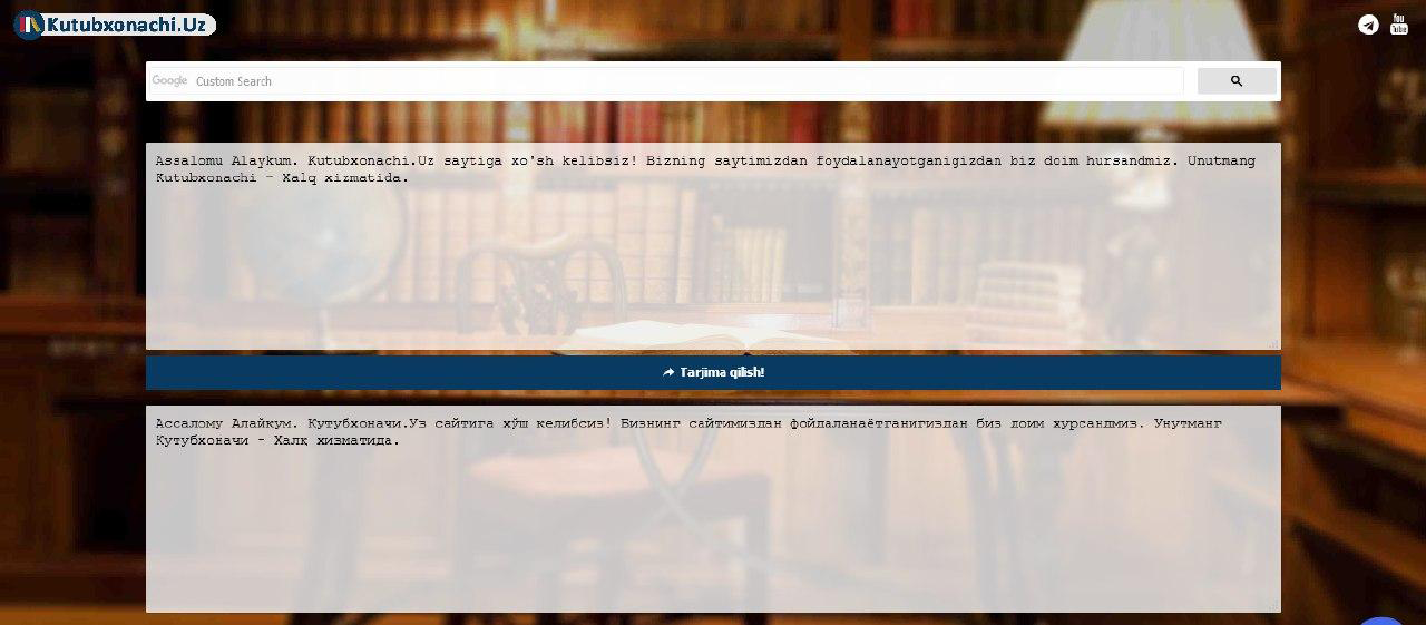Assalomu alaykum hurmatli kitobxon. Men Master Sherkulov taxallusi bilan faoliyat yuritadigan O'zbekistonlik dasturchiman! O'zbekiston Respublikasida Karantin e'lon qilingandan beri men yaratgan dasturlarimni kengaytirishga kirishdim va kutubxonachi.uz sayti uchun Kiril - Lotin nomli bo'lim qo'shdim! Bunda siz lotin harflaridan iborat matni kiritib qiyinchiliksiz kiril harflaridan iborat matnga o'girishingiz mumkin bu juda oddiy quyidagi linkni sizlar uchun qoldirdim.